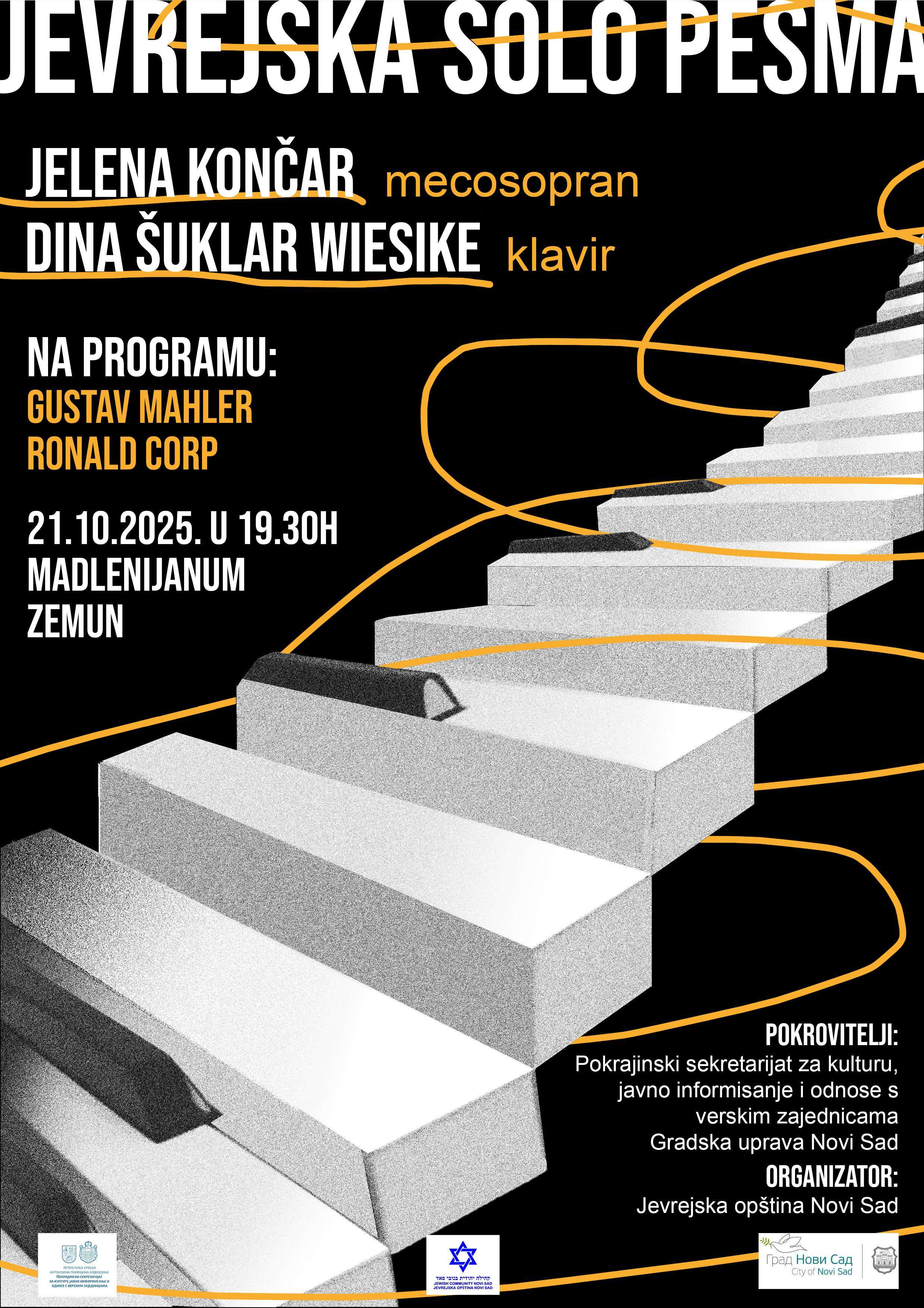 Projekat “Jevrejska solo pesma” koji će se održati u Madlenianumu, u utorak 21.10.2025. sa početkom u 19:30 časova. ima za cilj da ukaže na ogroman doprinos autora jevrejskog porekla svetskoj kulturnoj baštini u godini kada se navršava osamdeseta godišnjica od završetka Drugog svetskog rata i stradanja jevrejskog naroda u okviru Holokausta. Solo pesme Gustava Malera za glas i orkestar spadaju u red najznačajnijih i najlepših dostignuća klasične muzike u domenu vokalne lirike. “Lonina pisma” nastala su na osnovu pisama koje je Loni Rabl Frenkl, stradala u koncentracionom logoru Aušvic 12.10.1944. godine, slala svom unuku Piteru između 1939. i 1944. godine. Mnogo decenija kasnije, Piter je pronašao Lonina pisma, a njegov prijatelj, kompozitor Ronald Korp je na osnovu pisama napisao ciklus pesama za mecosopran, gudački kvartet i klavir. Delo je zamišljeno kao neka vrsta spomenika ne samo Loni Rabl Frenkl već čovekovoj sposobnosti da se nada i grčevito drži vizije bolje budućnosti ma kako mračne bile okolnosti u kojima se nalazi u datom trenutku. U okviru projekta “Jevrejska solo pesma” pesme će biti izvedene u verziji za glas i klavir.