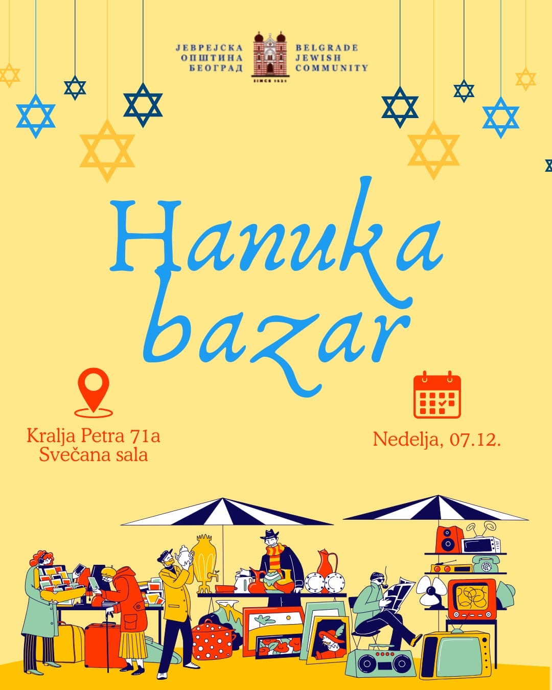 Jevrejska opština Beograd poziva sve članove zajednice, umetnike i kreativce da izlože svoje rukotvorine, umetničke, književne i druge radove na predstojećem Hanuka bazaru 2025, koji će se održati u svečanoj sali.