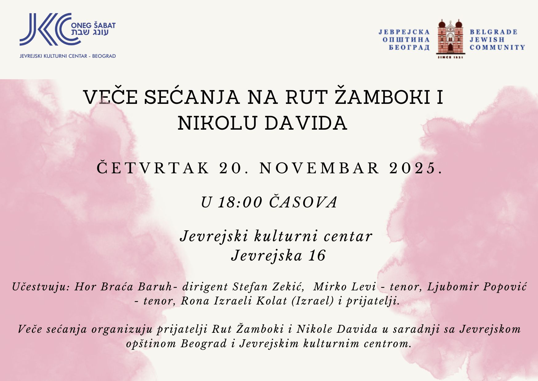 Pozivamo vas na Veče sećanja na Rut Žamboki i Nikolu Davida, koje će se održati u četvrtak, 20. novembra u Jevrejskom kulturnom centru u Beogradu, Jevrejska 16, sa početkom u 18:00 časova.
