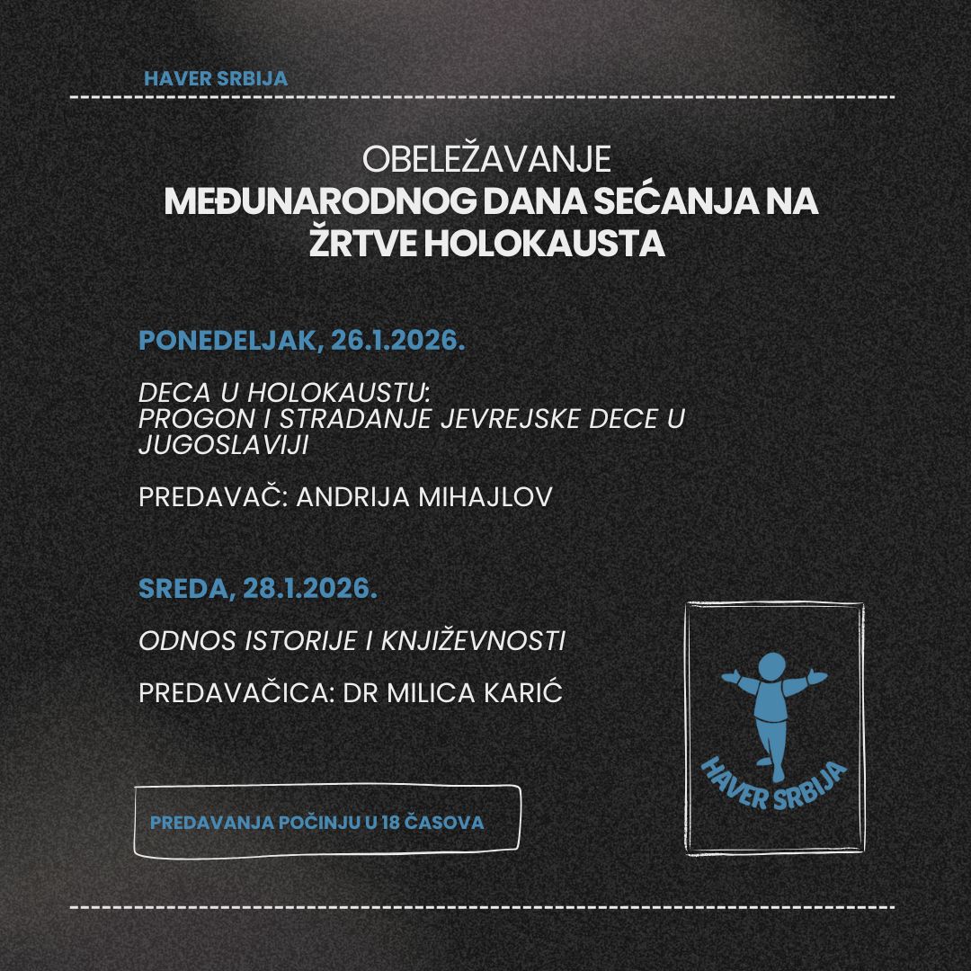 Povodom Međunarodnog dana sećanja na žrtve Holokausta, koji se obeležava 27. januara, udrženje Haver Srbija organizuje dva predavanja. Pozivamo Vas da nam se pridružite u ponedeljak, 26. januara i u sredu, 28. januara od 18 časova da kroz zajedničko učenje obeležimo ovaj datum.