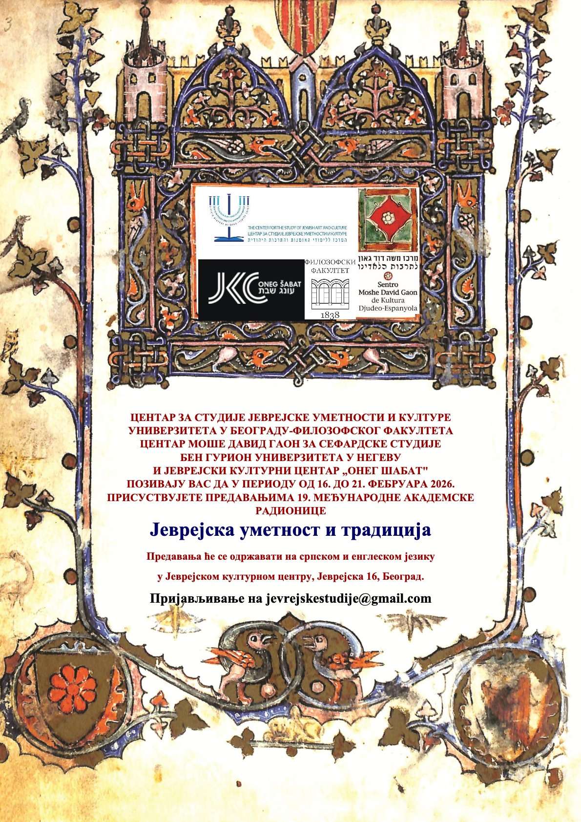 Centar za studije jevrejske kulture i umetnosti, Centar Moše David Gaon za sefardske studije Univerziteta Ben Gurion u Negevu i Jevrejski kulturni centar pozivaju vas na 19. međunarodnu radionicu „Jevrejska umetnost i tradicija“, koja će biti održana od 16. do 21. februara u Jevrejskom kulturnom centru.