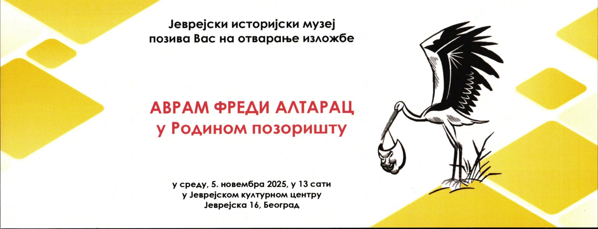 Jevrejski istorijski muzej poziva vas na otvaranje izložbe „Avram Fredi Altarac u Rodinom pozorištu“, autorke Barbare Panić, koje će se održati u sredu, 5. novembra u 13 sati, u Jevrejskom kulturnom centru.