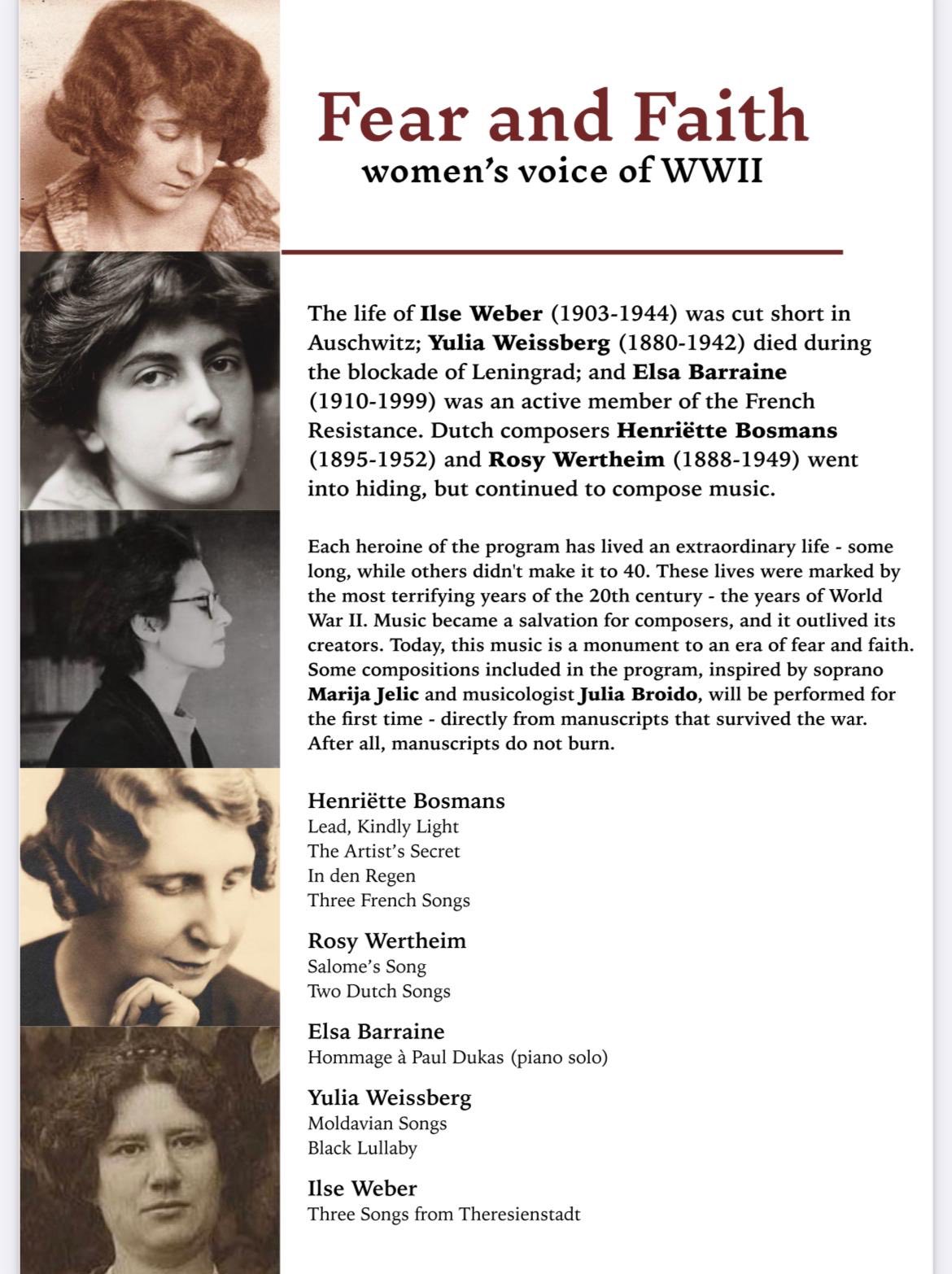 Koncert povodom Međunarodnog dana sećanja na žrtve holokausta donosi dela kompozitorki čiji su život i opus oblikovani ratnim iskustvom – Ilse Veber, Julije Vajsbeg, Else Beren, Henrijete Bosmans i Rosi Vertajm. Program istovremeno funkcioniše kao umetnički i istraživački poduhvat, rekonstruišući dela sačuvana u fragmentima i uključujući ih u savremeni koncertni život.