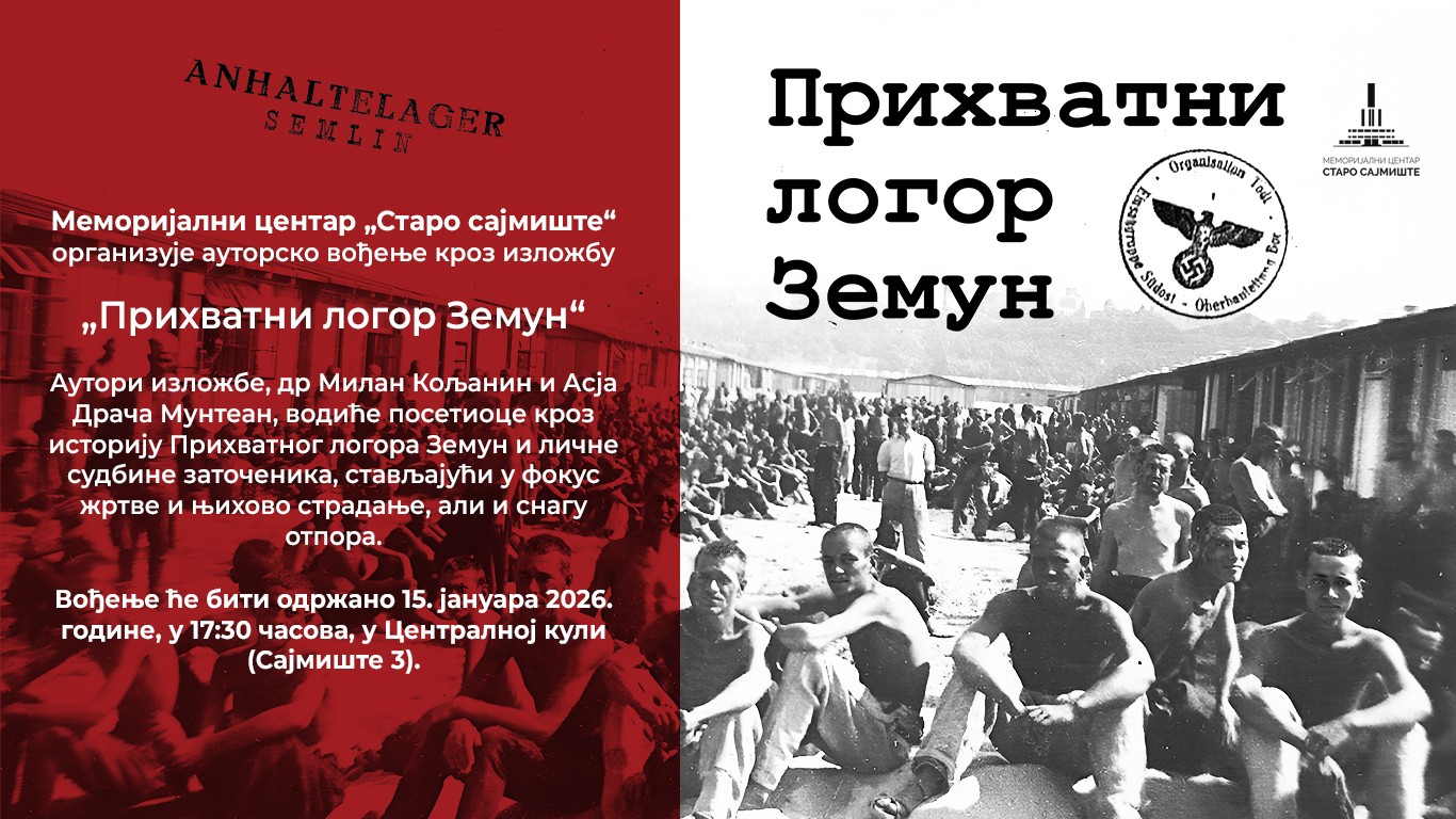 Poziv Memorijalnog centra „Staro sajmište“ na autorsko vođenje kroz izložbu „Prihvatni logor Zemun“, koje će biti održano 15. januara 2026. godine u 17.30 časova, u Centralnoj kuli (Sajmište 3).